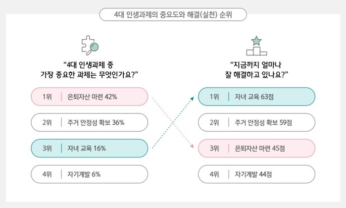 자녀교육에 대한 중간점수 평가는 63점으로 4대 인생과제 중 가장 높이 평가받았다. '자녀가 뒤쳐지지 않고 정상적인 삶을 살길 바라'기 때문이다.