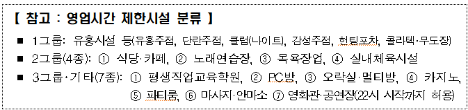 다만, 평생직업교육학원, PC방, 오락실·멀티방, 영화관·공연장 등 3그룹 및 기타 그룹은 종전과 같이 밤 10시 기준이 유지된다.