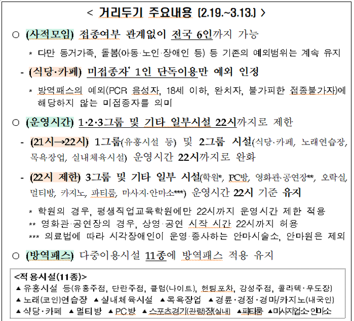사적모임은 종전과 같이 최대 6인까지 가능하며, 식당·카페의 경우에만 미접종자 1인 단독이용이 가능하다.