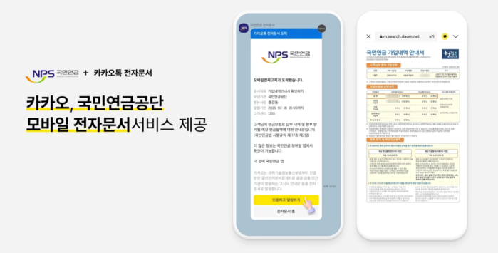 [메가경제=신승민 기자] 카카오가 국민연금공단과 협업해 모바일 전자문서 서비스를 제공한다고 19일 밝혔다. 카카오톡 이용자라면 별도의 회원가입이나 앱 설치 없이 연금 관련 다양한 문서를 간편하게 받아볼 수 있게 됐다.