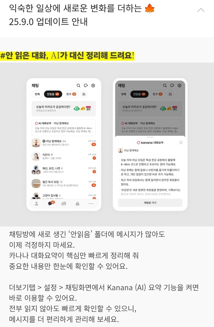 지난 21일 새롭게 추가된 카나나 AI 요약 기능도 사용해볼 만 하다. 이 기능은 대화가 많이 쌓여 안읽은 내용들을 AI가 추려줘 핵심 내용을 요약해준다.