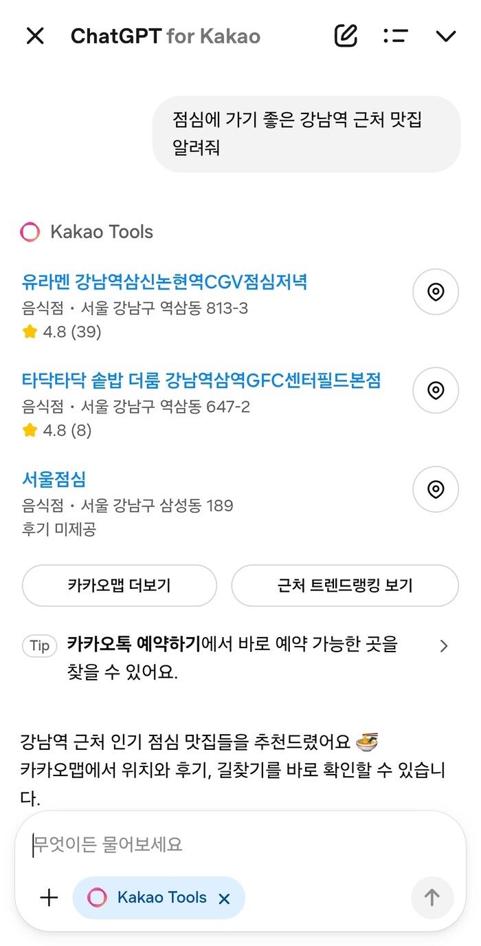 카카오톡 채팅창에 문장을 입력하자, 곧바로 '챗GPT'가 구체적인 매장 이름과 영업시간, 지도 링크까지 내놓았다. 이제 카카오톡 안에서도 챗GPT를 '친구처럼' 불러 쓸 수 있게 된 것이다.