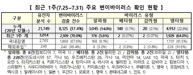 이로써 누적 변이 바이러스 건수는 델타형 4912건, 알파형 3045건, 베타형 148건, 감마형 20건으로 각각 늘었다.