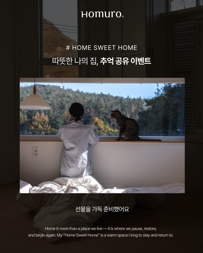 이번 이벤트는 ‘따뜻한 나의 집’을 주제로 개인이 느꼈던 포근한 순간을 사진 또는 릴스로 공유하면 누구나 참여 할 수 있도록 기획됐다. 호무로 제품이 없어도 참여 가능하며, 겨울 햇살이 드는 창가, 반려 동물과 함께한 고요한 시간, 가족과의 식사 등 일상 속 편안함이 담긴 순간이라면 자유롭게 업로드 할 수 있다.