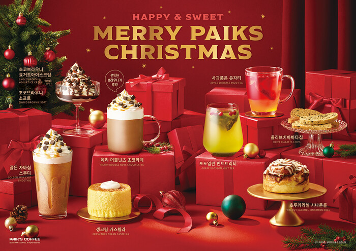 빽다방은 ‘HAPPY & SWEET, MERRY PAIKS CHRISTMAS’를 테마로 연말의 따뜻함과 설렘을 담은 신메뉴를 선보인다. 이번 라인업은 ▲메리 더블넛츠 초코라떼 ▲골든 자바칩 스무디 ▲초코브라우니 요거트아이스크림&소프트 ▲사과품은 유자티 ▲포도열린 민트트리티 ▲올리브치아바타칩 ▲생크림 카스텔라 ▲호두카라멜 시나몬롤 총 8종이다.