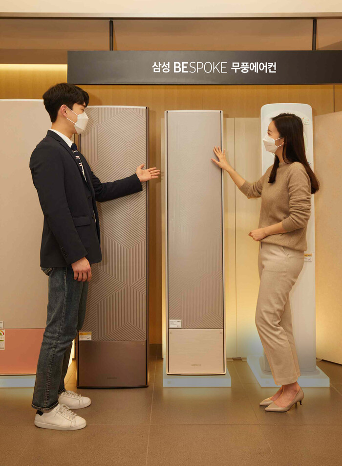 | ▲ 삼성 디지털프라자 강남본점에서 삼성전자 모델이 2022년형 '비스포크 무풍에어컨 갤러리'를 소개하고 있다. [삼성전자 제공] |