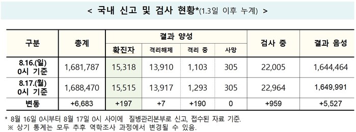 중앙방역대책본부(방대본)는 17일 0시 기준 전날 대비, 코로나19 신규 확진자가 197명이 늘어, 총 누적확진자 수는 1만5515명이라고 밝혔다.