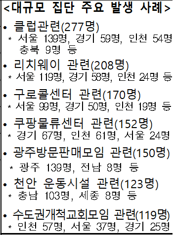 국내발생 무더기 집단감염 사례 가운데 신천지예수교 증거장막성전(신천지) 대구교회 관련 5214명에 이어 두 번째이다. 서울 이태원 클럽 관련 277명을 넘어섰다.