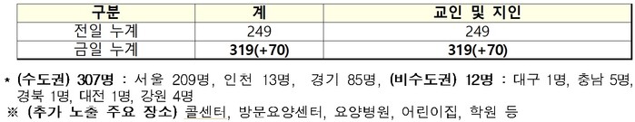 서울 성북구 사랑제일교회와 관련해, 70명이 추가 확진되어 현재까지 누적 확진자는 총 319명이 됐다.