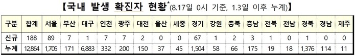 국내 발생자 188명을 지역별로 보면, 서울 89명을 비롯, 경기 67명, 인천 7명 등 수도권에서만 80%가 넘는 163명의 확진자가 나왔다. 이어 부산·광주 각 7명, 충남 3명, 충북·대전 2명, 대구·강원·경북·전북 각 1명 순이다.