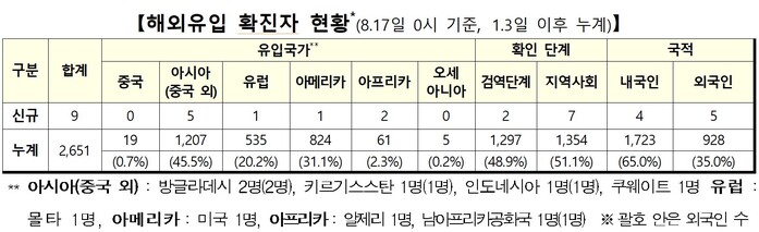 17일 0시 기준 해외유입 확진자는 9명이다. 2명은 입국 검역과정에서 확진됐고, 7명은 지역사회나 생활치료센터에서 자가격리 중 확인됐다. 해외유입 확진자 중 내국인은 4명, 외국인은 5명이다.