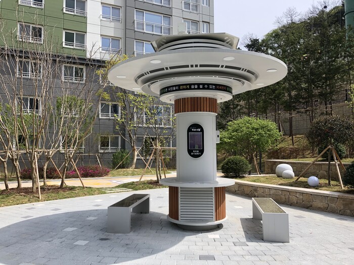 | ▲ ‘힐스테이트 연제’에 설치된 에어돔의 모습. 타워 주변으로 돔 형상의 공기막을 형성해 돔 내부에 정화된 깨끗한 공기를 공급한다. [사진= 현대엔지니어링] |