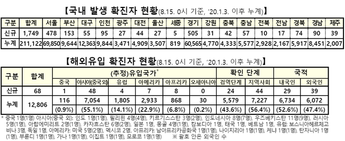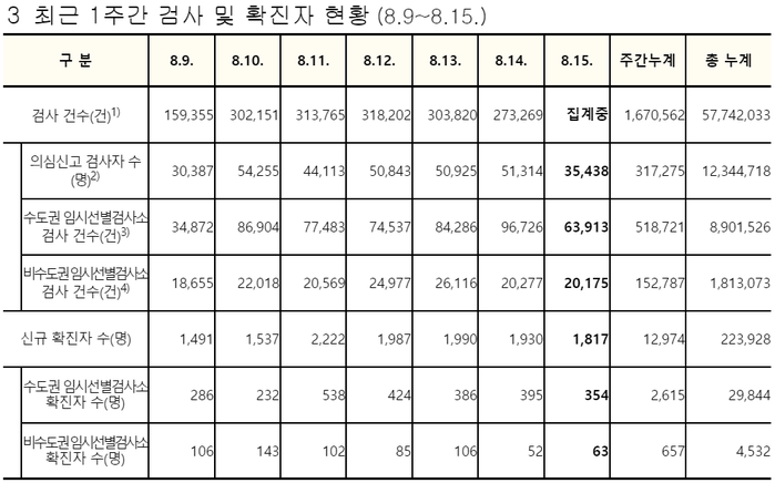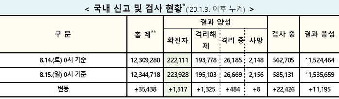 중앙방역대책본부는 15일 0시 기준으로 코로나19 신규 확진자가 1817명 발생해 지금까지 누적 확진자는 22만3928명(해외유입 1만2806명)으로 집계됐다고 밝혔다.