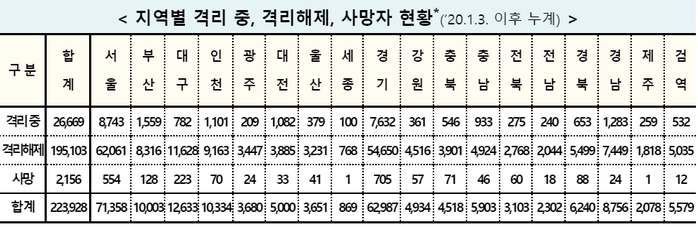 ▲ 15일 0시 기준 코로나19 지역별 격리 및 확진자 현황. [출처=중앙방역대책본부] |