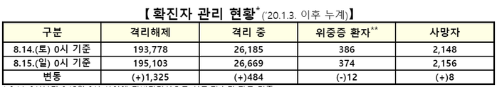 ▲ 15일 0시 기준 코로나19 확진자 관리 현황. [출처=중앙방역대책본부] |