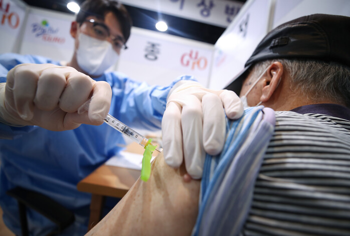 ▲ 국내에서 코로나19 백신 접종이 시작된 지 100일을 이틀 앞둔 3일 오전 서울 구로구 오류아트홀에 마련된 접종센터에서 의료진이 백신 접종을 하고 있다. [사진=연합뉴스] |