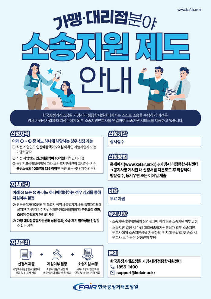 이번 사례는 공정위 제재만으로는 피해 보상이 이뤄지지 않는 구조 속에서, 조정원의 소송지원제도가 영세 가맹사업자의 실질적 민사적 권리구제를 가능하게 했다는 점에서 주목된다. 해당 제도는 경제적·시간적 여건상 소송 수행이 어려운 가맹점주와 대리점주를 대상으로 소송비용을 지원하고 무료로 법률 대리를 제공한다.