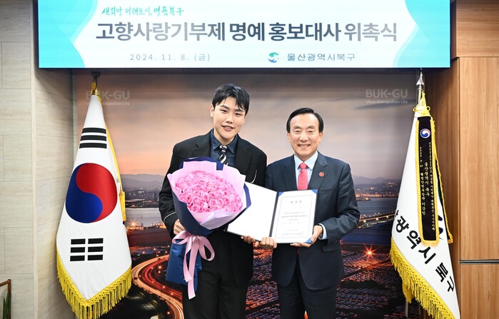 | ▲가수 고정우가 울산 북구청에서 열린 고향사랑기부제 홍보대사 위촉식에 참석해 명예 홍보대사로 임명돼 사진 촬영에 임하고 있다. [사진= 장군엔터테인먼트] |