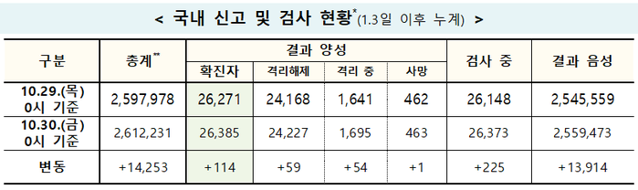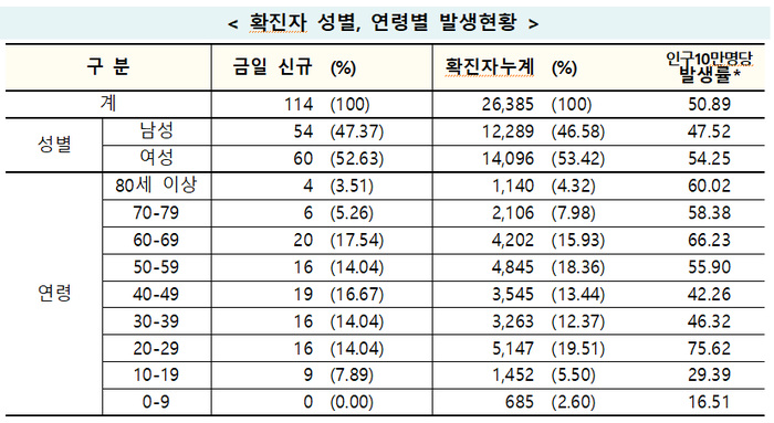 중앙방역대책본부(방대본)는 30일 0시 기준으로 전날 대비 코로나19 신규 확진자가 114명 추가돼 누적 2만6385명이라고 밝혔다.