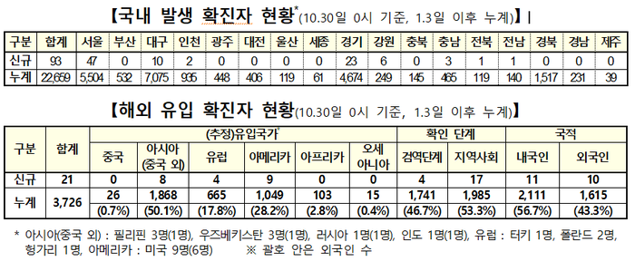 신규 확진자 114명 중 지역사회에서 감염된 것으로 추정되는 국내발생(이하 지역발생)은 93명이고, 해외유입은 21명이다. 해외유입 누적 확진자수는 3726명을 기록했다.