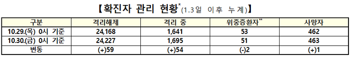 ▲ 30일 0시 기준 코로나19 확진자 관리 현황. [출처= 중앙방역대책본부] |