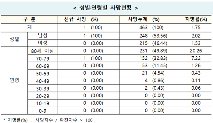 전날 하루 1명이 더 목숨을 잃어 누적 사망자는 463명(치명률 1.75%)이었고, 위중증환자는 하루 새 2명이 감소해 51명이다.