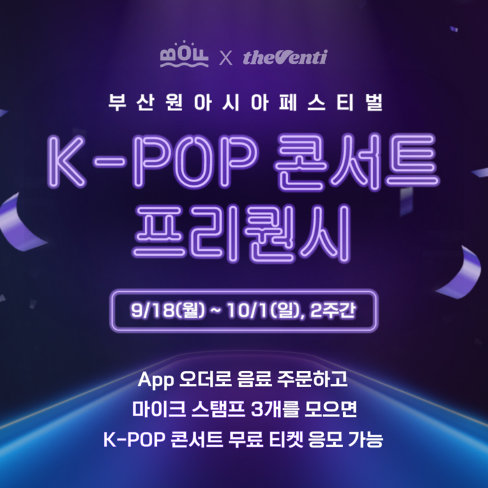 더벤티 관계자는 “케이팝(K-POP) 스타가 총출동하는 부산원아시아페스티벌은 아시아를 대표하는 문화 관광 축제로 더벤티가 후원사로 참여하여 K-커피의 위상도 함께 높일 수 있게 됐다”며 “더벤티의 가을 시즌 음료를 포함한 다양한 메뉴를 즐기고 콘서트 티켓도 받을 수 있는 기회가 되길 바란다”고 말했다.