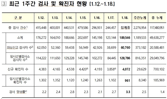 특히 주목할 만한 수치는 검사 양성률이다. 이날 검사 양성률은 3.3%로, 전날(2.7%)보다 0.6%포인트 높아졌다.
