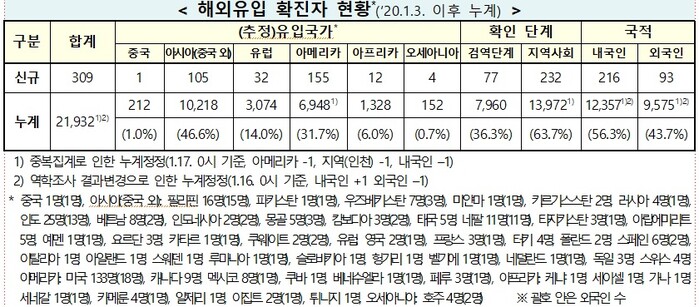 해외유입 309명을 분류하면 입국 검역단계에서 77명이 확인됐고, 지역사회에서 자가격리 중 232명이 확진됐다. 국적별로는 내국인 216명, 외국인 93명이다.