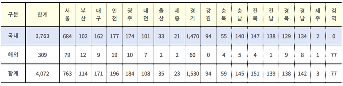신규 확진자 4072명 중 국내 지역발생은 3763명이고, 해외유입은 309명이다. 지역발생은 212명, 해외유입은 2명 각각 전날보다 많다. 지역발생은 사흘째 3천명대 중후반, 해외유입은 나흘째 300명대를 나타냈다.