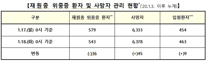 위중증 환자는 543명으로 전날보다 36명 줄면서 이틀 연속 500명대로 집계됐다.