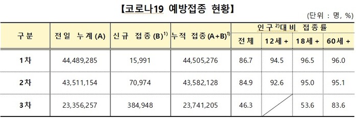 전국민 1차 접종률은 86.7%(4450만5276명)이고, 2차 접종률은 84.9%(4358만2128명)이다.