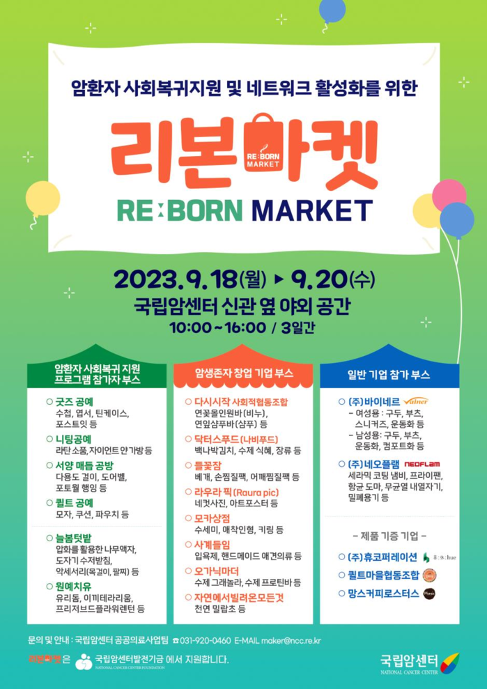 [메가경제=주영래기자] 국립암센터(원장 서홍관)가 9월 18일(월)부터 20일(수)까지 3일간 국립암센터 신관 옆 야외공간에서 ‘암환자 사회복귀 지원 및 네트워크 활성화를 위한 2023년 리본(ReːBorn) 마켓’을 개최한다.