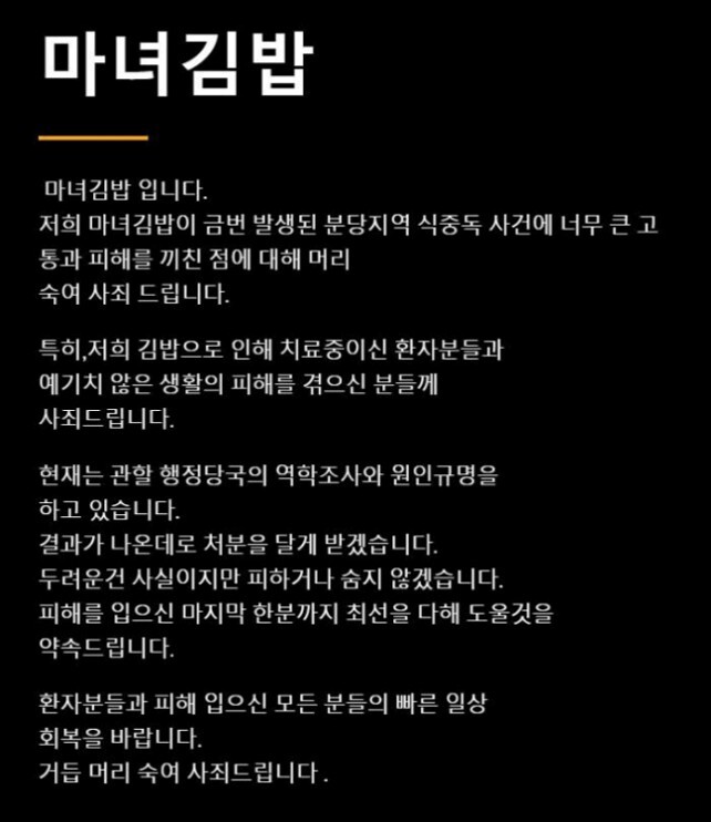 ▲ 2021년 마녀김밥 운영사가 집단 식중독 사고 후 게제한 사과문. [사진=SNS] |