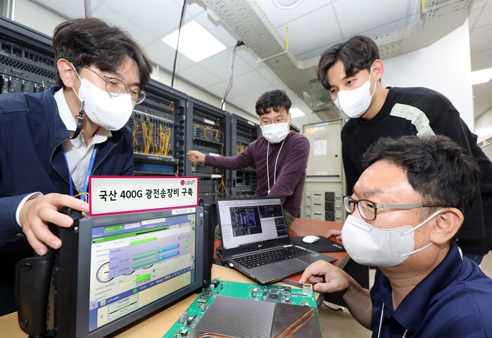 | ▲ LG유플러스와 코위버 직원들이 새로 개발한 400G 광전송장비를 테스트하고 있는 모습. [사진=LG유플러스 제공] |