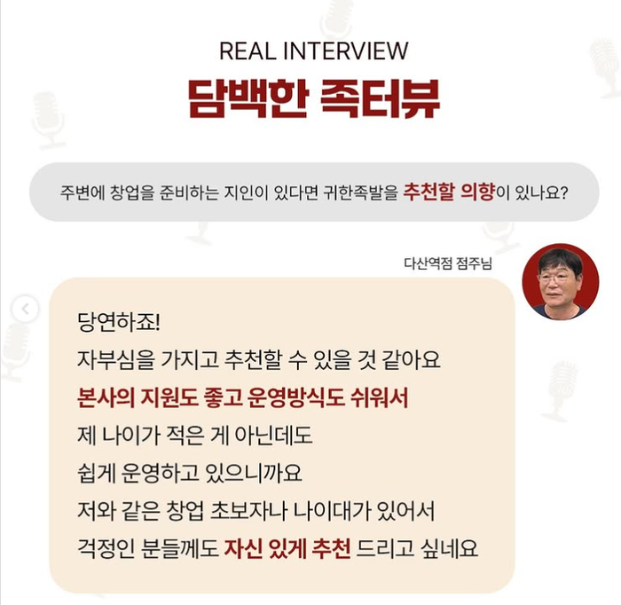 이어 "당시 맛과 매장, 위생, 서비스를 전부 충족할 수 있는 매장을 선별한 고집이 점주와 소비자들에게 신뢰를 얻는 계기가 됐다"며 "코로나19 당시 업종 변경을 문의하는 점주분들이 많았으며 가맹점이 자리 잡을 때까지 슈퍼바이저를 통해 첫 출발을 지원했다"고 덧붙였다.