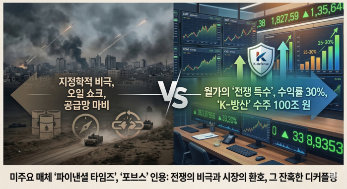 중동의 어두운 밤하늘이 미사일과 드론으로 뒤덮일 때, 뉴욕 증시의 전광판은 묘한 긴장감 속에 엇갈린 숫자를 내뱉었다. 이란과 이스라엘 간의 전면전 위기가 고조되면서 실물 경제는 ‘오일 쇼크’와 함께 ‘공급망 마비’라는 공포에 직면한다. 하지만 월가의 특정 섹터들은 사상 최고치를 경신하며 이른바 ‘전쟁 특수’를 누리고 있다. 이는 지정학적 비극이 수익률로 치환되는 시장의 잔혹한 디커플링, 즉 따로 노는 탈동조화다.