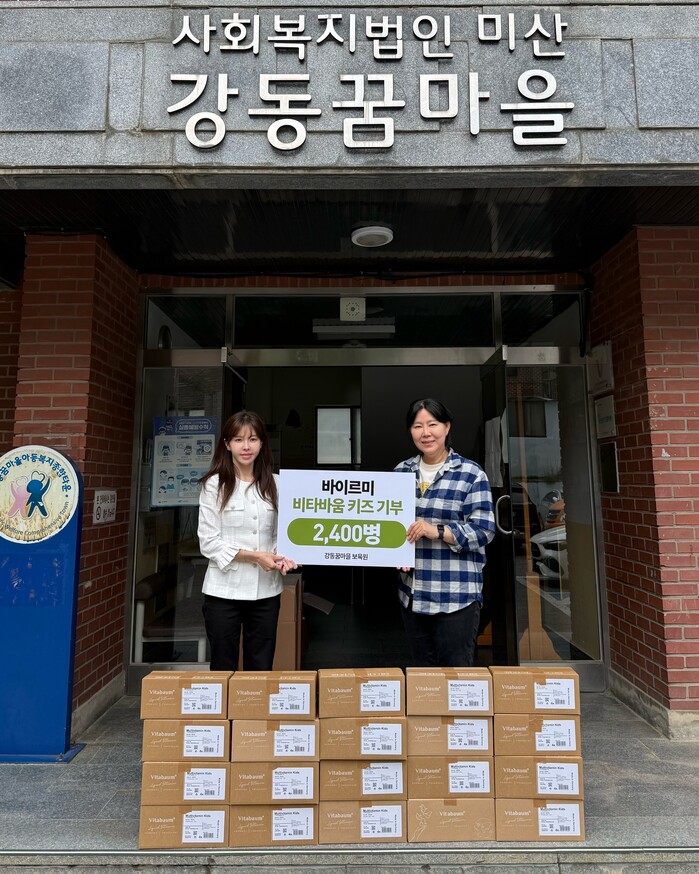 바이르미는 28일 서울 강동구에 위치한 아동복지시설 ‘강동꿈마을’ 보육원을 찾아 독일산 프리미엄 비타민 ‘비타바움 키즈’와 ‘비타바움 틴즈’ 총 2400병을 전달했다.
