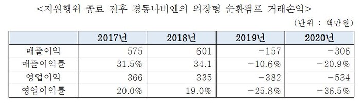 경동나비엔은 경동원의 지원행위가 중단되자 2019년과 2020년에 큰 손실을 냈다.