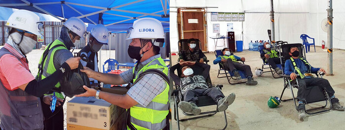 | ▲ (왼쪽) 반도건설 현장소장과 직원들이 무더위에 지친 근로자들에게 아이스크림과 얼음물을 나눠주고 있다. (오른쪽) 무더위 시간대 냉방시설이 구비된 휴게공간에서 휴식을 취하는 현장 근로자들 [사진=반도건설 제공] |