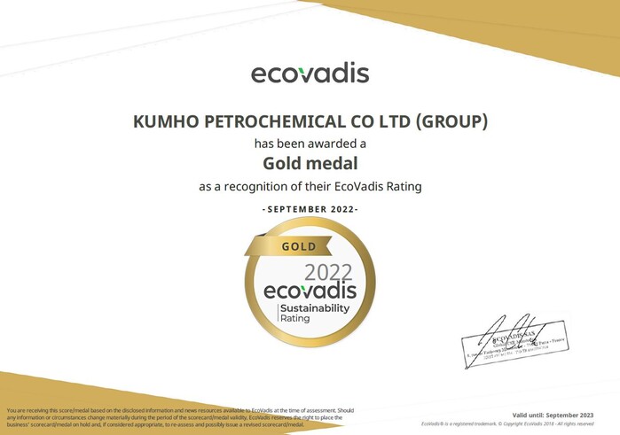 금호석유화학은 27일 글로벌 ESG 및 지속가능성 평가기관인 '에코바디스(EcoVadis)'로부터 골드(Gold) 등급을 획득했다고 밝혔다.