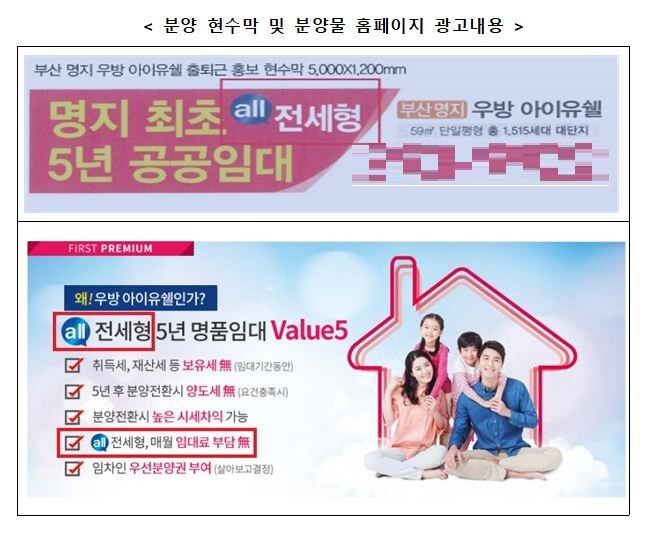 공정위에 따르면, 에스엠하이플러스는 부산시 강서구 화전지구에 있는 '화전 우방아이유쉘' 아파트의 시행사로, 지난 2017년 1월부터 10월까지 이 아파트를 임대 분양하는 과정에서 신문·방송·전단지 등을 통해 '전체 전세형 임대주택으로 월세에 대한 부담이 없다' 등의 문구를 넣어 광고했다.