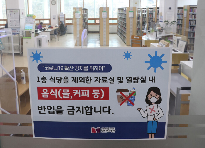 ▲ 지난달 29일 오후 서울 용산구 남산도서관에 식당 외 음식 반입 금지 안내문이 붙어 있다. 코로나19 대응을 위한 기본 방역수칙이 시행되면서 독서실·스터디카페, 노래연습장, 영화관·공연장, 도서관 등 21개 업종에서는 이날부터 음식 섭취가 금지됐다. [서울= 연합뉴스] |