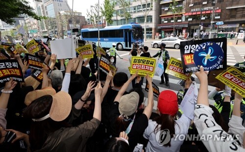 ▲ 16개월 된 입양아 정인양을 학대해 숨지게 한 혐의를 받는 양부모의 1심 선고 공판이 열린 14일 오전 서울 양천구 서울남부지법 앞에서 시민들이 양모 장씨가 탄 것으로 보이는 호송차를 향해 피켓을 들고 항의하고 있다. [사진=연합뉴스] |