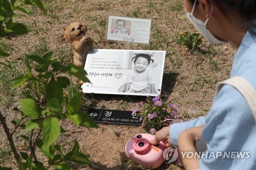 ▲ 16개월 된 입양아 정인양을 학대해 숨지게 한 혐의를 받는 양부모의 1심 선고공판이 열린 14일 경기도 양평군 하이패밀리 안데르센 공원묘원에서 참배객이 정인양을 추모하고 있다. [양평=연합뉴스] |