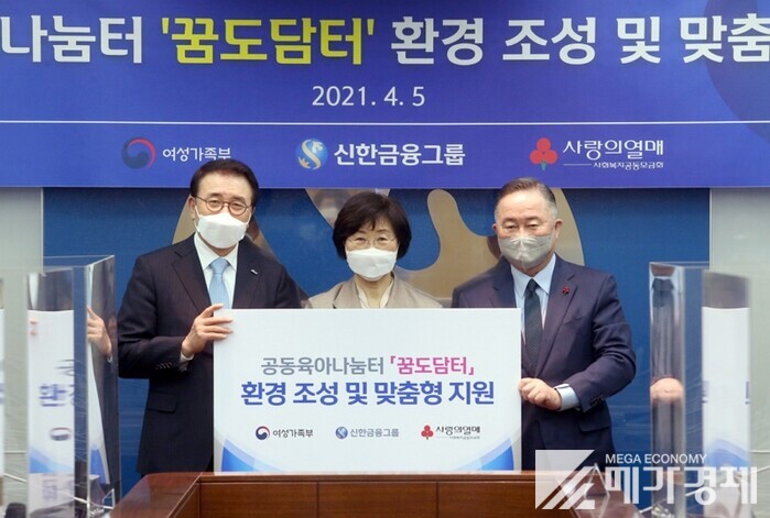 [메가경제=황동현 기자] 신한금융그룹(회장 조용병)은 5일 오후 서울 중구 세종대로 본사에서 여성가족부(장관 정영애) 및 사회복지공동모금회(회장 예종석)와 「공동육아 나눔터 ‘꿈도담터’ 환경 조성 및 맞춤형 지원사업 추진을 위한 업무협약」을 체결했다.