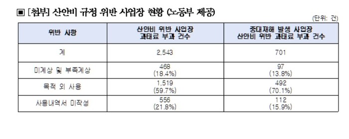 안호영 국회의원(국회 기후에너지환경노동위원장, 전북 완주·진안·무주)이 고용노동부로부터 제출받은 자료에 따르면, 최근 5년간 산안비 집행 규정을 위반한 사업장은 총 2,543곳이며, 이 가운데 701곳(27.5%)에서 중대재해가 발생했다. 위반 유형별로는 △‘목적 외 사용’이 1519건(59.7%)으로 가장 많았고, △‘사용내역서 미작성’ 556건(21.8%) △‘미계상 및 부족 계상’ 468건(18.4%)이 뒤를 이었다.