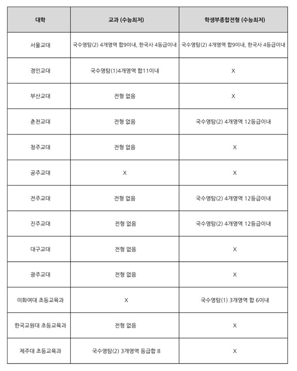 또한, 수능최저학력 기준을 요구하는 대학도 있는 만큼 수능 공부에도 부족함이 없어야 할 것이다. 서울교대의 경우 교과 및 종합전형 모두 국어, 수학, 영어, 탐구과목 4개 영역 등급 합 9이내, 한국사 4등급이내를, 경인교대는 교과전형에서 4개영역 합 11이내를 요구한다. 지방교대 중에는 춘천, 전주, 진주교대 학생부종합전형에서 4개영역 12등급 이내, 이화여대 학생부종합전형과 제주대 교과전형은 각각 3개영역 합 6등급이내와 3개영역 등급 합 8등급이내를 요구한다.