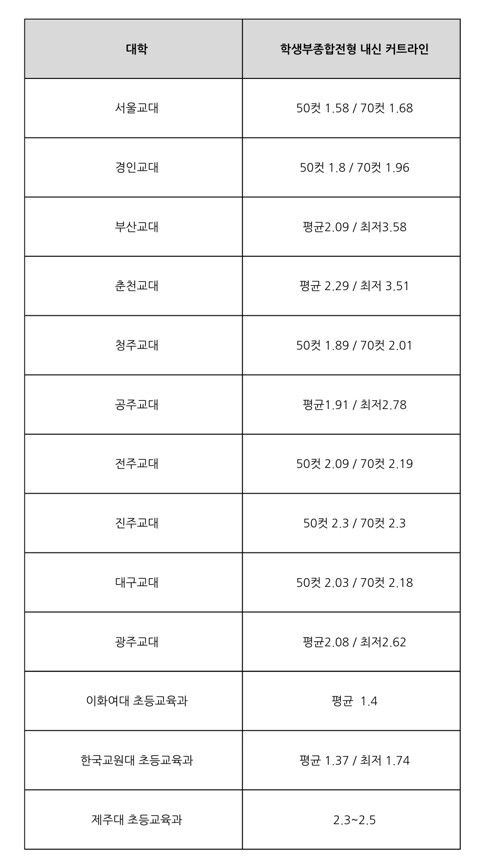 | ▲주요 교대 및 초등교육과 학생부종합전형 커트라인 (2023학년도 성적 기준) |