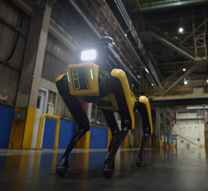 4족 보행 로봇 스팟은 산업 현장에서 이동하기 힘든 좁은 공간과 계단 등을 자유롭게 움직일 수 있으며, 특히 유연한 관절의 움직임을 활용하여 사람의 눈으로 확인하기 힘든 사각지대까지 파악할 수 있다.